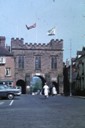 35 m slide - High Street, Bridgnorth (continued) The Northgate, High Street, (H/S). - (H/S north). Northgate colour photograph with flags. C.1970's.