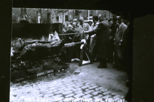 35 m slide - High Street, Bridgnorth, Events. - (North) - Outside Northgate House / Coronation of H.M. Queen Elizabeth II. Ox Roasting. 'The Mayor takes a hand at basting'. 2nd June, 1953.