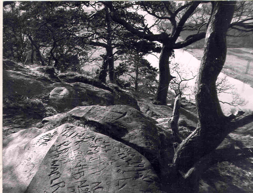 black and white photograph - High Rock, Bridgnorth. Gaffitti on sandstone, with river Severn below.