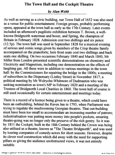 information sheets. A4. The Town Hall and the Cockpit Theatre, Bridgnorth. Alan Webb. 3 sheets. (plus copies)
