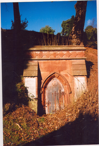 photograph - a group of six - Bridgnorth cemetery and the family tomb of the Colley family. carved on the tomb are the words 'Through the gate of death we pass to our joyful resurrection'.